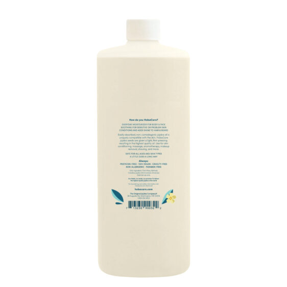 Our 32 fl oz filtered HobaCare Jojoba oil is the ideal size if you have discovered ALL the amazing ways to incorporate the beneficial qualities of jojoba into your personal care routine. If you are using jojoba as a pre-/post-shave oil, skin moisturizer, hair mask & conditioning, facial oil cleansing, or as a carrier oil for essential oil blends, this size will help you save money. This 32 oz hypoallergenic Jojoba oil is also perfect for refilling dispensers for individual family members, and all those bottles can be conveniently kept at points of use throughout the home or office. Also available in Certified Organic Clear Jojoba Oil.