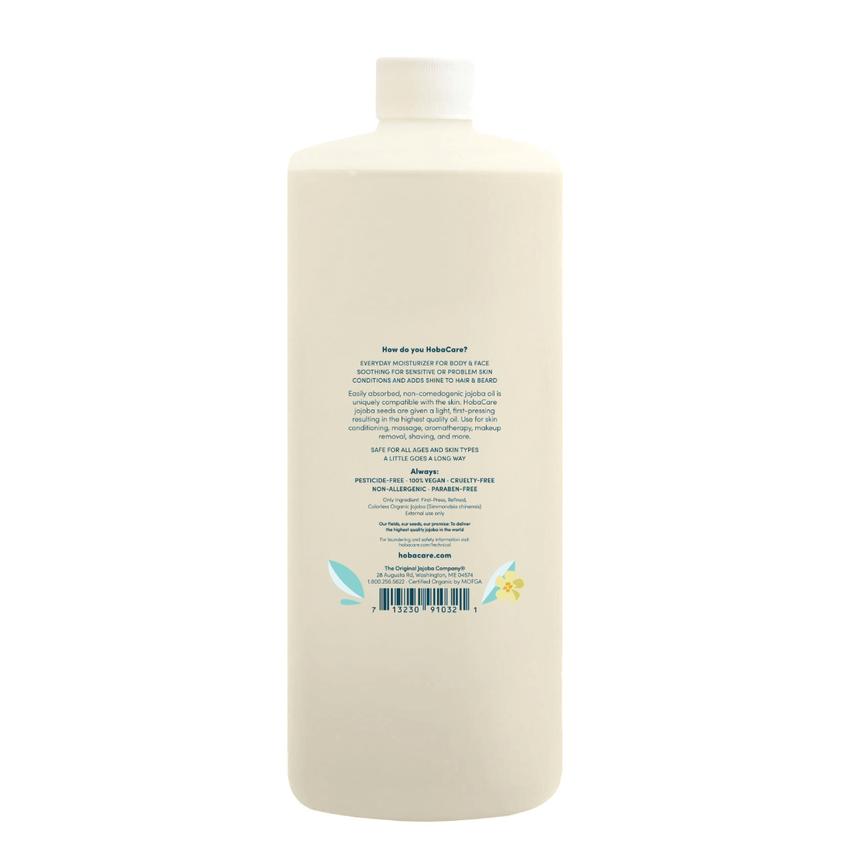 Our 32 fl oz HobaCare Jojoba is the ideal size if you have discovered ALL the amazing ways to incorporate the beneficial qualities of jojoba into your personal care routine. If you are using jojoba as a pre-/post-shave oil, skin moisturizer, hair mask & conditioning, facial oil cleansing, or as a carrier oil for essential oil blends, this size will help you save money. This 32-oz hypoallergenic Jojoba oil is also perfect for refilling dispensers for individual family members, and all those bottles can be conveniently kept at points of use throughout the home or office.