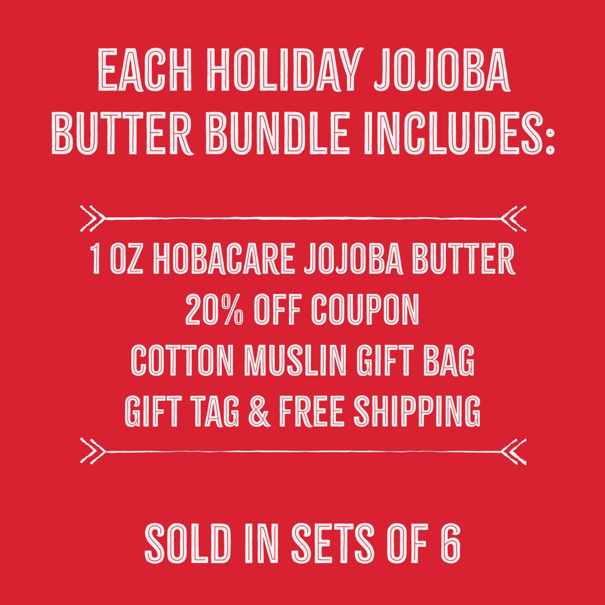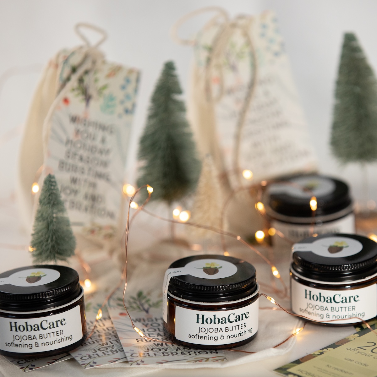 Each HobaCare Holiday Butter Bundles includes a 1 oz Jojoba Butter a lovely cotton gift bag with a beautiful gift tag, and a coupon for future purchases where you can enter your referral code that you create on our website. They will get 20% off, and you will get $10 worth of Jojoba Seed Rewards. As an added bonus, you will receive Free Shipping on the gift packs! Sold in bundles of 6