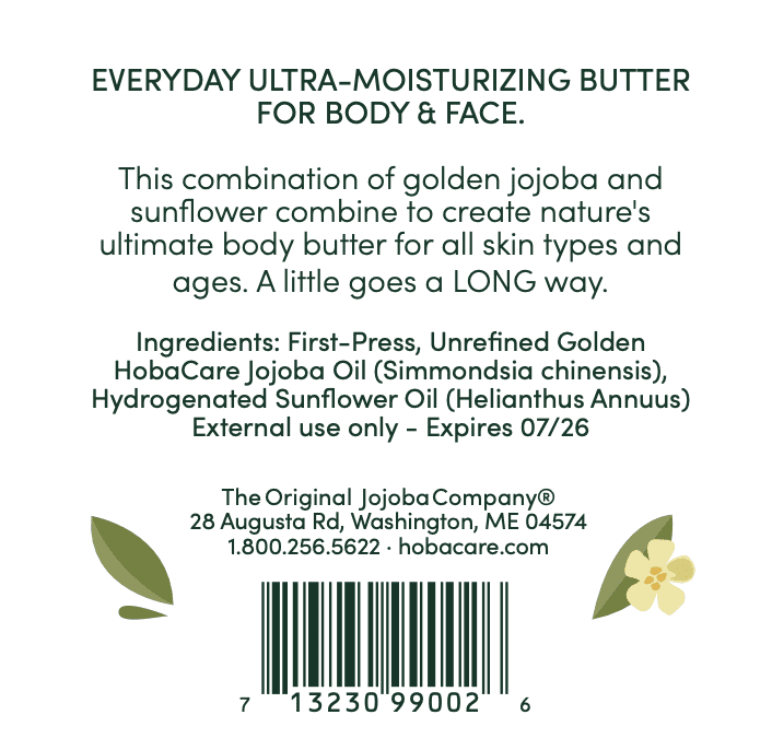 Ingredients: First-Press, Unrefined Golden HobaCare Jojoba Oil (Simmondsia chinensis), Hydrogenated Sunflower Oil (Helianthus Annuus) External use only