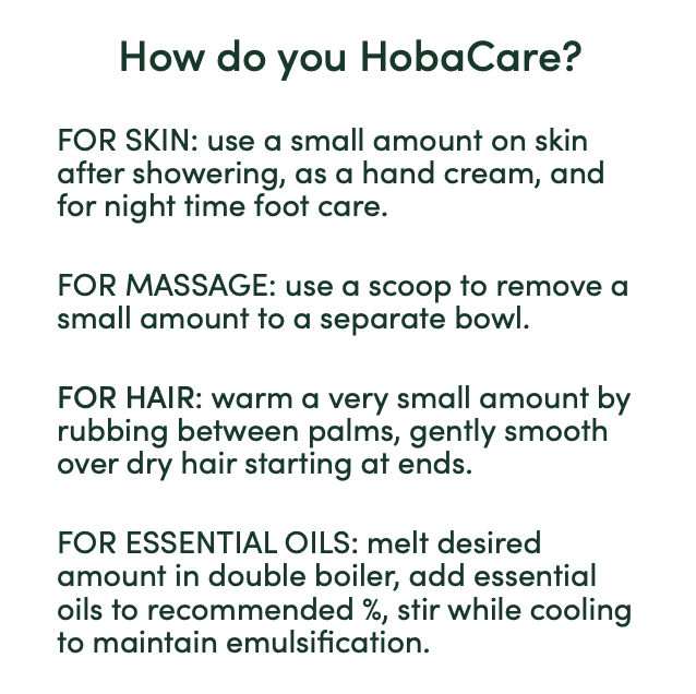 HobaCare’s softening Jojoba butter for the body and face is scent free, which makes it the ideal carrier for adding your own scents or essential oils. Add peppermint for a refreshing foot cream: add arnica to create a pain relieving muscle cream, add menthol, spearmint, eucalyptus or essential oils to make a cooling muscle rub or a soothing chest cream to help ease congestion, add lavender, chamomile, and vetiver to create a relaxing nighttime hand cream to help soothe you to sleep.