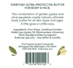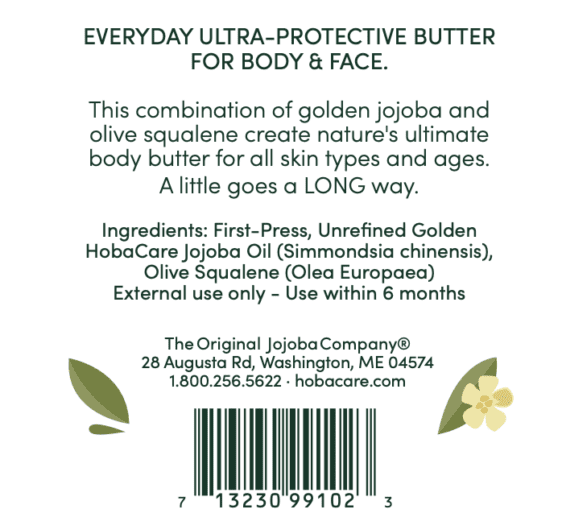 Ingredients: First-Press, Unrefined Golden HobaCare Jojoba Oil (Simmondsia chinensis), Olive Squalene (Olea Europaea) External use only – use within 6 months.