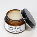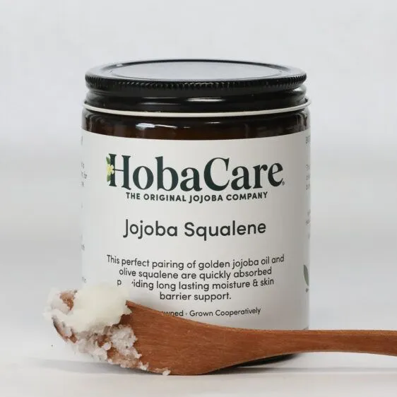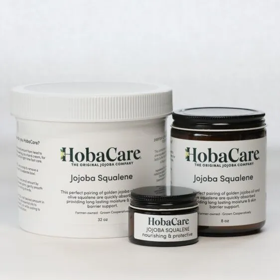 Olive squalene is one of the body’s natural lipids and is found in human sebum. Its role is to protect the skin from outside stressors and help moisturize the skin. Squalene is the naturally occurring form, which makes it more prone to oxidation. Most skincare formulations use squalane (note the ‘a’ instead of the ‘e’ after the ‘l’), which is the hydrogenated form of squalene. The process of hydrogenation makes it shelf-stable. Our HobaCare Squalene uses the natural form of squalene because the virtually indefinite shelf life of jojoba helps stabilize it, which allows us to use its natural form instead of hydrogenated squalane. Jojoba oil and Olive Squalene is also available in 1 oz and 32 oz sizes.