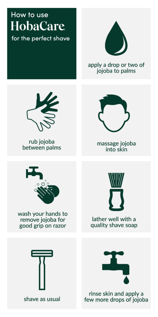 Since jojoba is non-allergenic & non-comedogenic, it is perfect for use on the face as a pre-shave balm. HobaCare jojoba conditions and softens allowing for a closer shave. Jojoba is also naturally anti-inflammatory making it soothing to the skin and reducing the risk of razor burn, it’s especially beneficial for those with sensitive skin.Jojoba can be used as a skin-soothing natural pre-shave oil, simply rub a few drops of jojoba between palms and into skin before shaving or mix equal amounts of jojoba and 100% pure aloe vera gel together. Be sure to wash hands well before picking up that razor to be sure you get great grip on your razor. After applying jojoba to skin, continue shaving as usual. We highly recommend using an all-natural, non-toxic shaving soap, if you can find a small producer all the better!